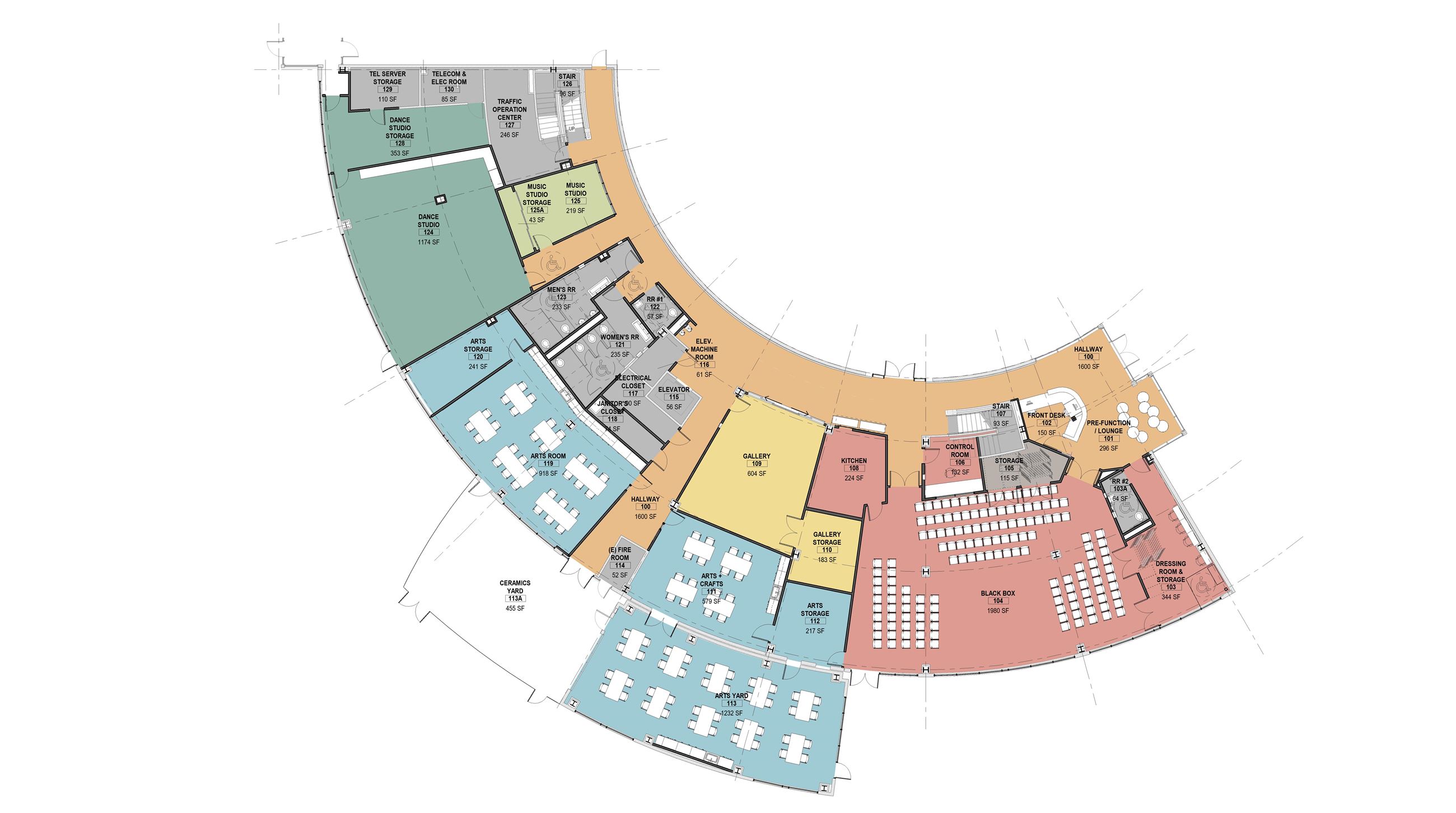 Construction of the Center began in November 2022 and is anticipated to be completed in 2026. The Precinct Black Box Theater and Gallery 180 are two new program features for the City. These anchor spaces are at the forefront of planning efforts. The Center will also feature programable spaces: the Mixed Media Room, Arts and Crafts Room, Ceramics Studio/Arts Yard, Dance Studio, and Music Studio. Each space will host classes and programs tailored to its specific focus.
