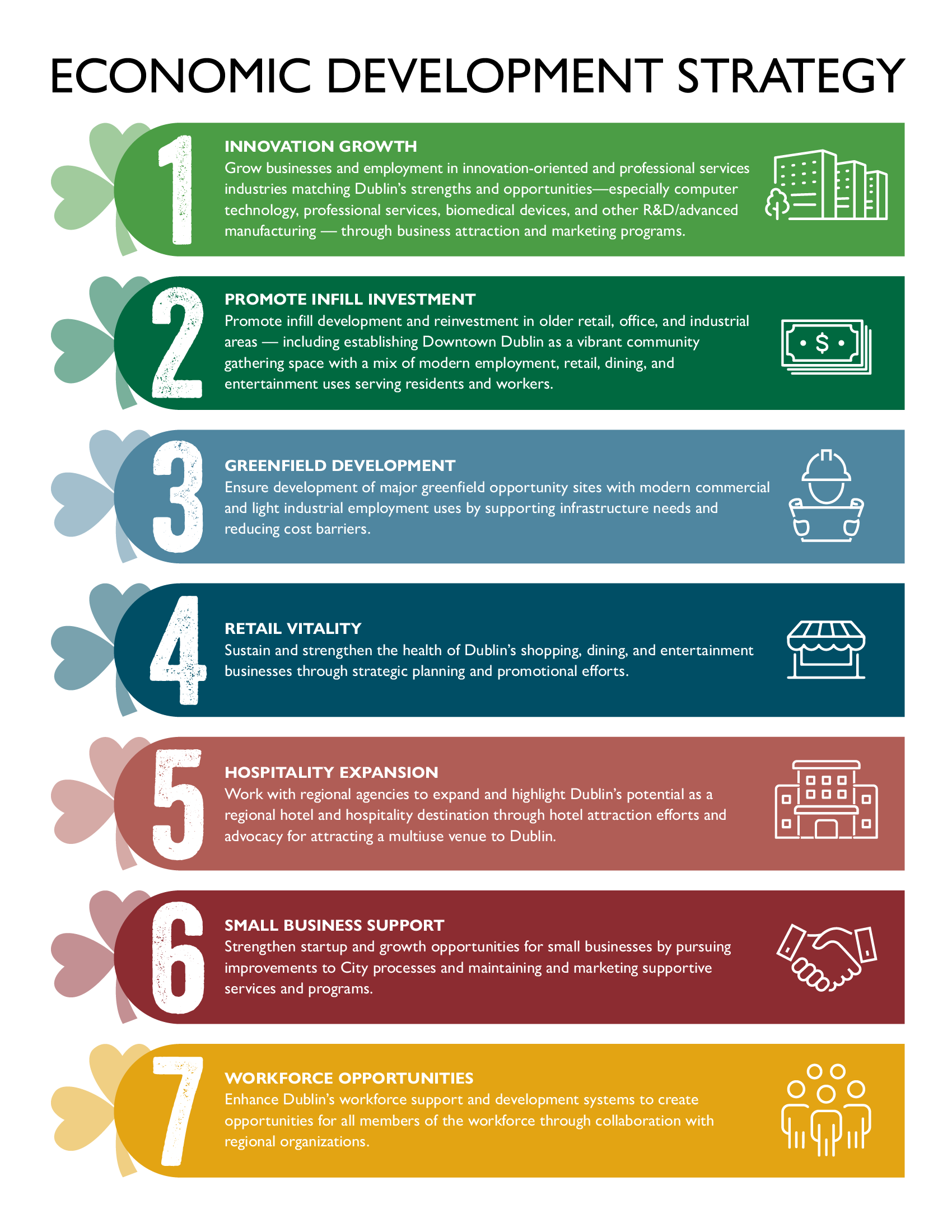 The economic development strategy is a strategic planning document and planning process that helps guide the economic growth and development of our community. The City of Dublin’s economic development efforts help to maintain a high quality of life by supporting businesses, jobs, and tax revenues that fund City services.